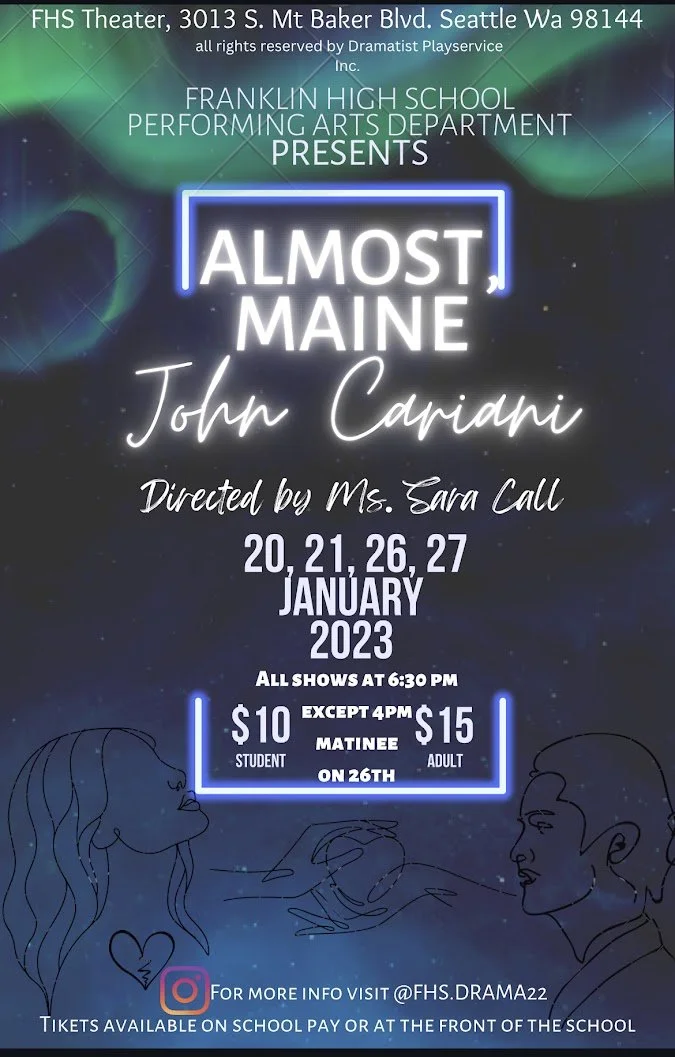 This year, the FHS Drama Club is putting on a play called Almost Maine. Almost Maine is a collection of vignettes about a small rural town. Sara Call, Franklin’s dedicated theater teacher, told me audiences “should be excited about seeing a show where all the actors have good, strong roles that show a variety of emotions and showcase their talent.” The show is directed by Ms. Call and assistant directed by Franklin senior, Evon Hussein. Hussein says, “People should be excited to see the show because we’re doing a lot of new stuff we couldn’t do last year. We can have a full house, seating 400 people per show. Last year, we had to wear masks, take a covid test before every show, and had to stay 6-ft apart on stage.”